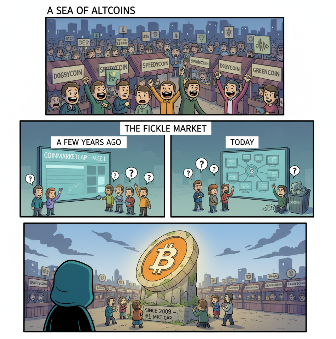 사실, 이것은 수많은 알트코인들의 이야기입니다. 셀 수 없이 많은 알트코인들이 '비트코인을 보완한다', '비트코인의 단점을 제거했다', '더 기술이 뛰어나다'라고 주장하며 나타났지만, 비트코인은 2009년 출범 이래로 지금까지 단 1초도 시가총액 1위의 자리에서 내려온 적이 없습니다. 비트코인의 엄청난 네트워크 효과는 다른 어떤 알트코인과도 비교할 수 없습니다. 비트코인이 단지 '선점효과만을 가진 구식 코인'에 지나지 않았다면, 비트코인은 그런 네트워크 효과를 가지지 못했을 것이며, 진작 그 자리에서 끌어내려져 역사 속으로 사라졌을 것입니다. 반면, 불과 몇 년 전 coinmarketcap.com의 첫 페이지에 존재했던 알트코인들 중 얼마나 많은 것이 교체되었는지는 아마 기억하는 사람도 별로 없을 것입니다.