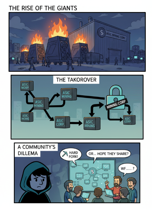 그렇게 어찌어찌 네트워크가 돌아가면서 $FBTC는 가격을 갖게 됩니다. 이것을 보고, 진짜 비트코인인 $BTC를 채굴중이던 업체들 중 일부가 $FBTC에 대한 ASIC을 새로 개발합니다. 그런데 일반 채굴자들에 비해 이 전문 채굴업체들의 해시파워가 너무나 크기 때문에 $FBTC 채굴은 중앙화됩니다. 네트워크상의 대부분의 블록이 이들에 의해 채굴되기 때문에 탈중앙화는 훼손되고 검열저항성을 잃으며 사실상 일반 은행이 되어버립니다. 이 단계에서 $FBTC 커뮤니티는 이 강력한 채굴자들이 알아서 해시레이트를 줄여주기를 기대하든지, 아니면 이들의 ASIC을 무력화하는 하드포크를 강행해야 합니다.